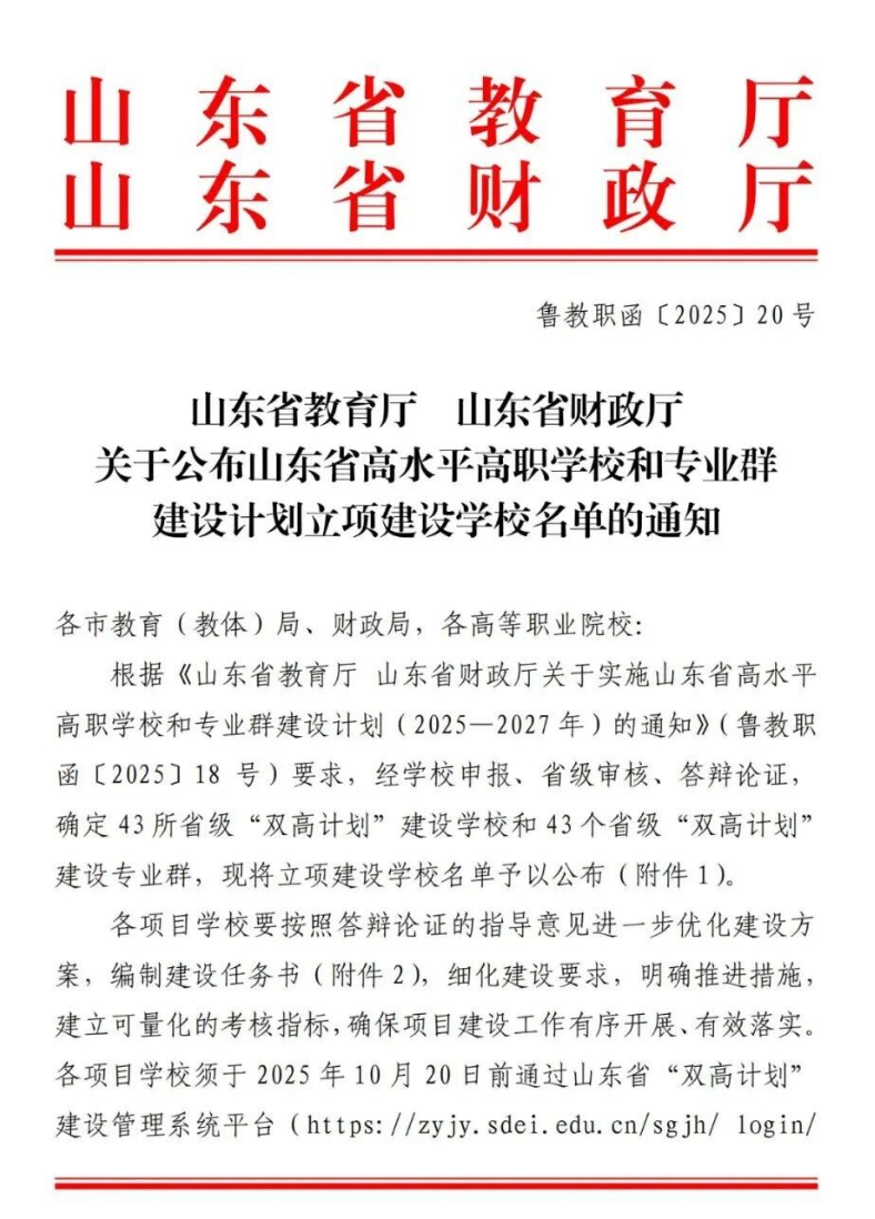 根据《山东省教育厅山东省财政厅关于实施山东省高水平高职学校和专业群建设计划(2025—2027 年)的通知》(鲁教职函〔2025〕18 号)要求,经学校申报、省级审核、答辩论证,确定 43 所省级“双高计划”建设学校和 43 个省级“双高计划”建设专业群。